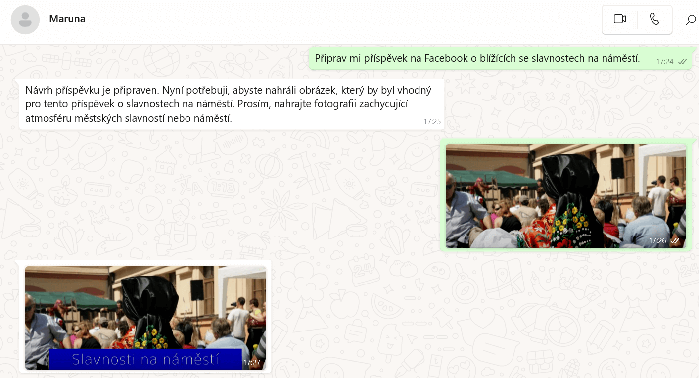Maruna má vlastní telefonní číslo, na které skrze WhatsApp zašlete instrukce o novém příspěvku. Můžete použít text nebo hlasovou zprávu. Maruna rozumí přirozenému jazyku, a tak nemusíte nic složitě strukturovat. Zprávu tak můžete nahrát třeba během jízdy v tramvaji.